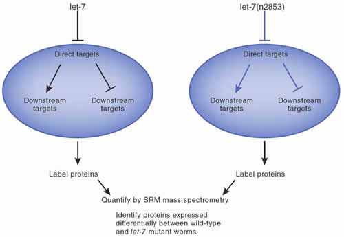 恩加特納等人利用線蟲let-7突變體及其野生型為實驗材料。為了測定由於let-7突變體數量減少導致的蛋白含量的下降,恩加特納等人對感興趣的let-7突變體和野生型的蛋白提取物進行化學標記,之後對其進行SRM質譜分析,獲得了可靠的目標蛋白的定量數據。該實驗使用了一套let-7可能的靶點基因及一套對照基因。結果發現,161個蛋白中的29個蛋白的表達含量在突變體中發生變化,這可能是由於let-7基因和不同的靶點互作結果——該結果得到了獨立下遊實驗包括遺傳互作、多聚核糖體分析和熒光素酶檢測的驗證。